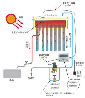 電磁弁を開くと水道圧で貯湯槽に水が入ります。貯湯槽内に取り付けられた水位センサーにより満水を感知すると電磁弁が閉じて給水は止まります。太陽光が真空ガラス管に当たるとガラス管内部の水温が上昇し、サイフォンの原理で高温のお湯は貯湯槽に上がって行き、自然対流により冷たい水がガラス管に戻ります。暖められたお湯を使用する場合は、浴室内のソーラー専用の水道蛇口を回すと自然落下でお湯が出てきます。熱くなり過ぎる場合は、水で薄めて使用します。 |